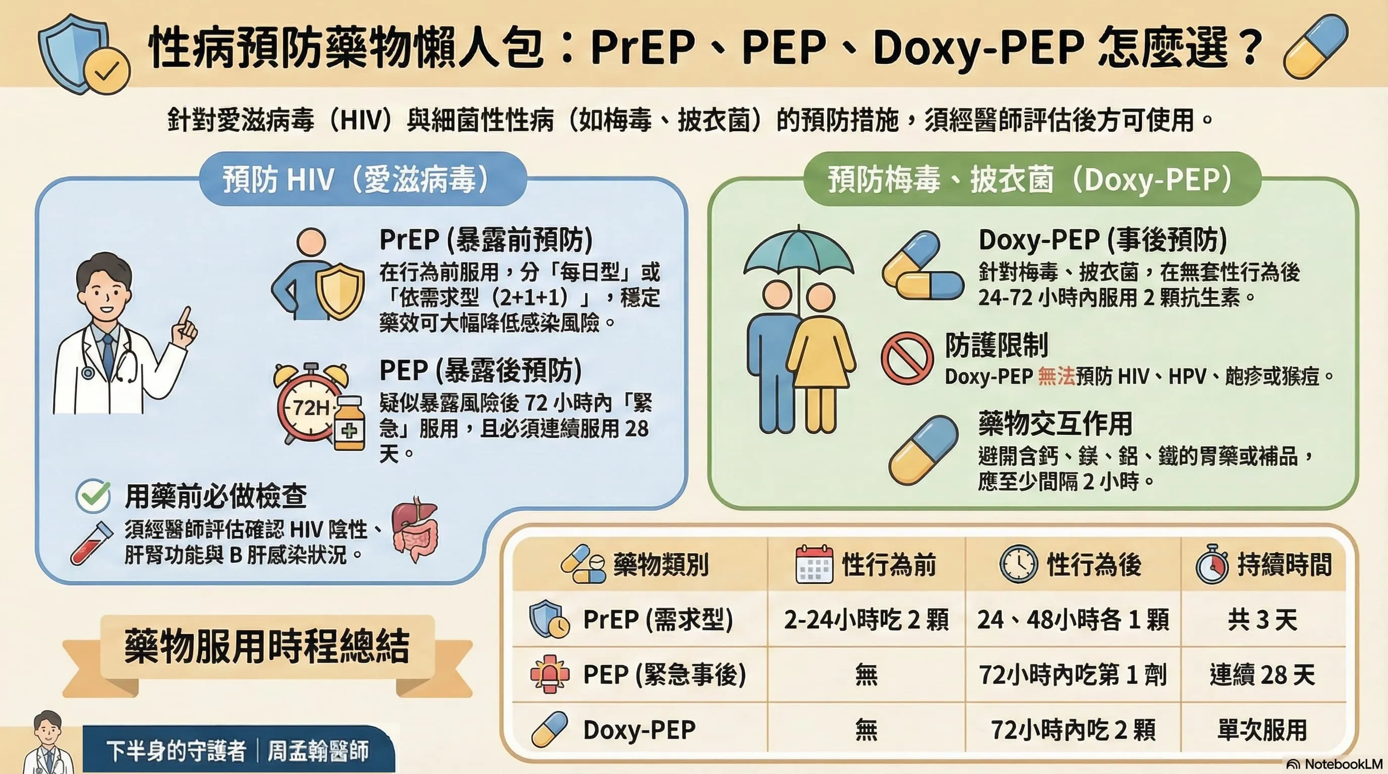 - 後續追蹤:療程結束後,需於 6 週、3 個月(必要時至 6 個月)追蹤 HIV 與其他性病檢測。